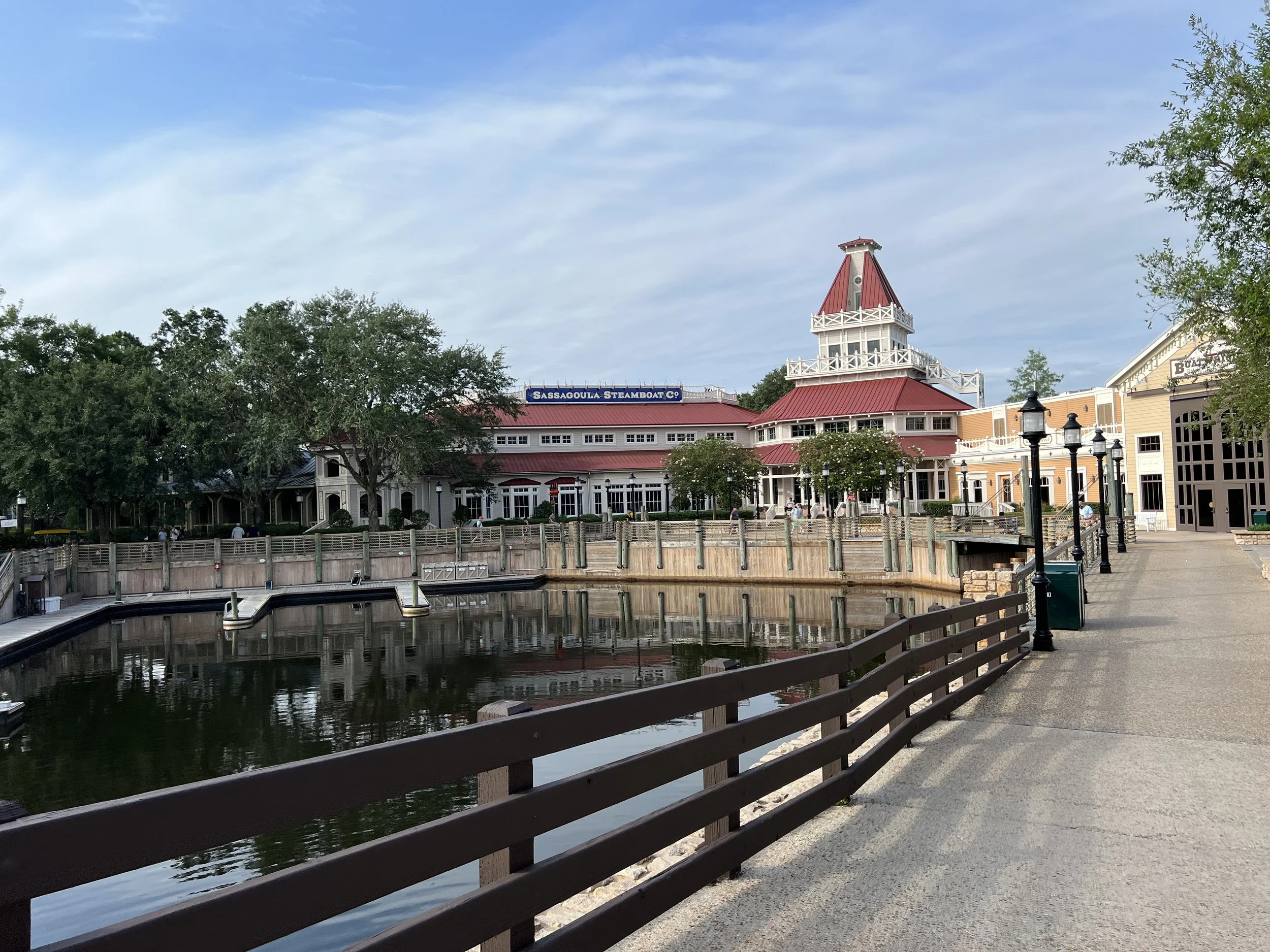 Ride the boat to Disney Springs Its about a 20 minute ride down the river to Disney Springs. You’ll pass Port Orleans - French Quarter, Old Key West Resort and Saratoga Springs Resort on the way to Disney Springs. You can get off the boat at any of these stops to explore and dine. Then when you’re done, hop back on to finish the ride or go back to your resort.