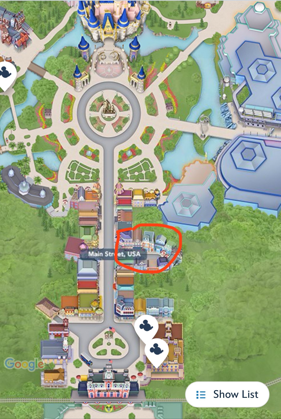 Tucked away on Main Street, U.S.A., the small area beside Crystal Arts is a peaceful escape from the crowds. There’s usually a bit of shade, and it’s out of the main traffic flow, making it a great spot to rest your feet at the tables with chairs and umbrellas. If you listen, you'll hear some voice lessons happening!
