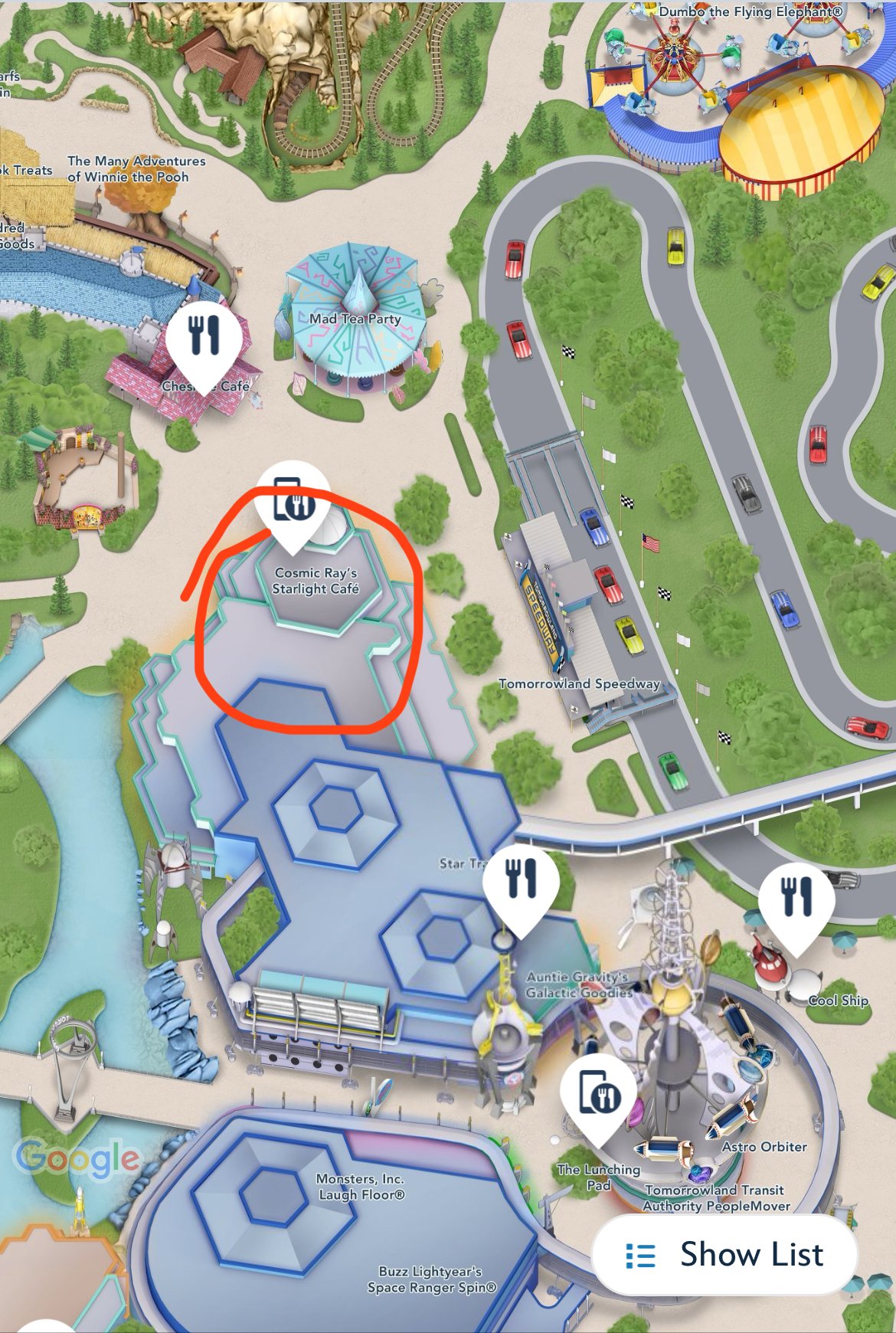 Oddly enough, this spot has some secluded benches that provide a decent resting place. It’s in a relatively quiet section of Tomorrowland, making it a good place to close your eyes for a few minutes.
