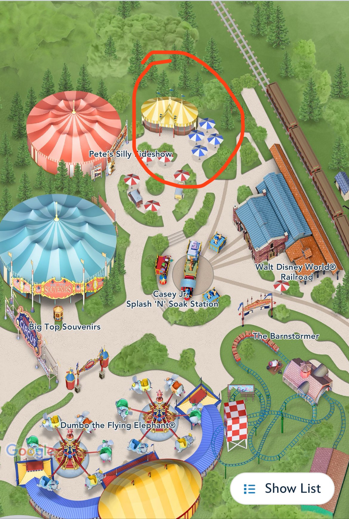 Over in Storybook Circus, you’ll find a large, covered tent that has chairs and sofas. There are power outlets and trash cans and ceiling fans! This area is great to take a seat in a shaded area perfect for a short break.